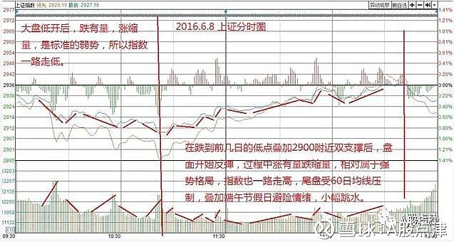 以上是大周期的技术分析。在大盘分时级别,技术分析也是非常有用的,例如大盘分时线的涨跌量能变化可以很好的辅助判断是否转势,关键点位甚至可以帮助我们精确把握转折点(引用之前文章中的举例配图):
