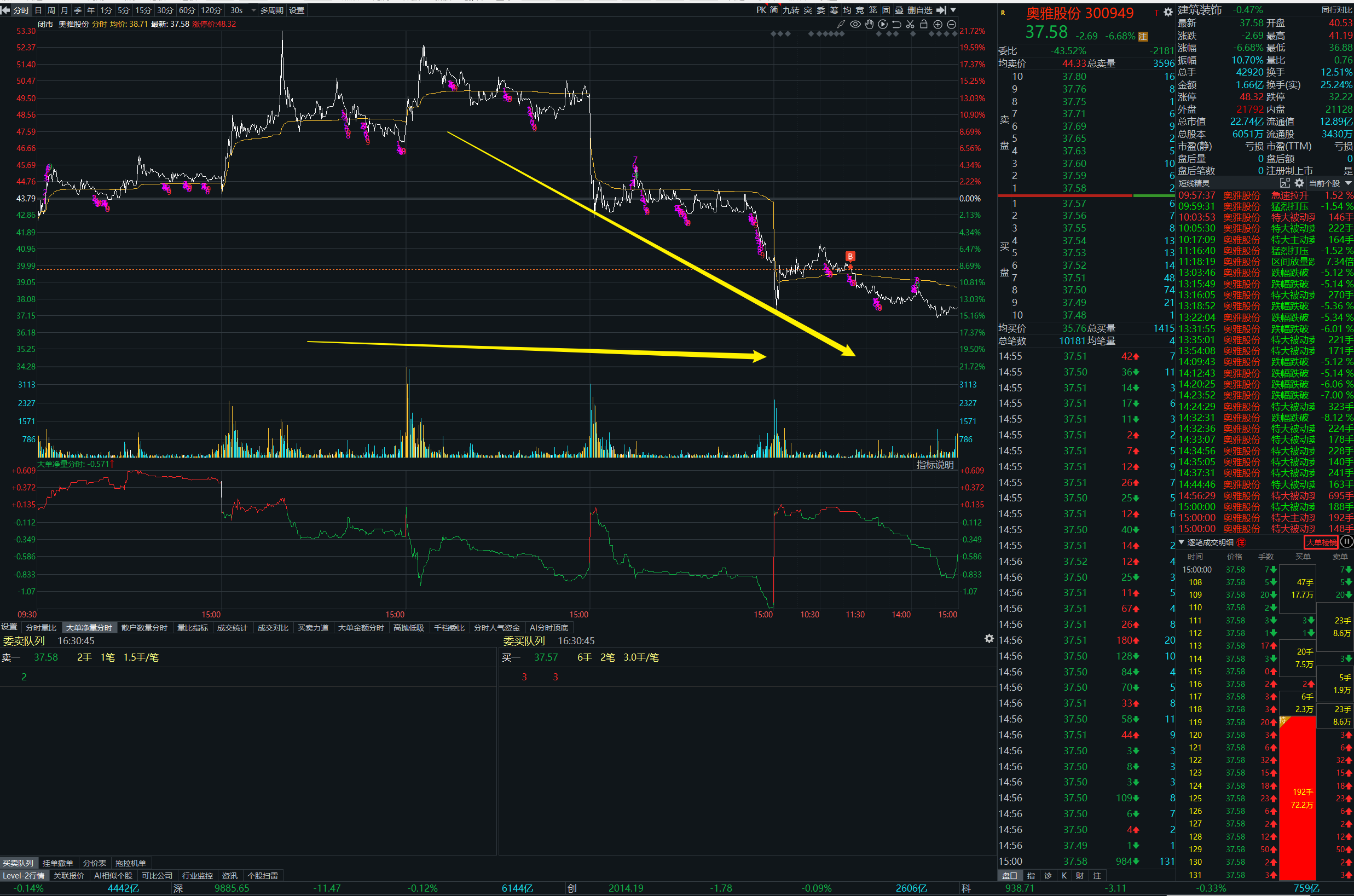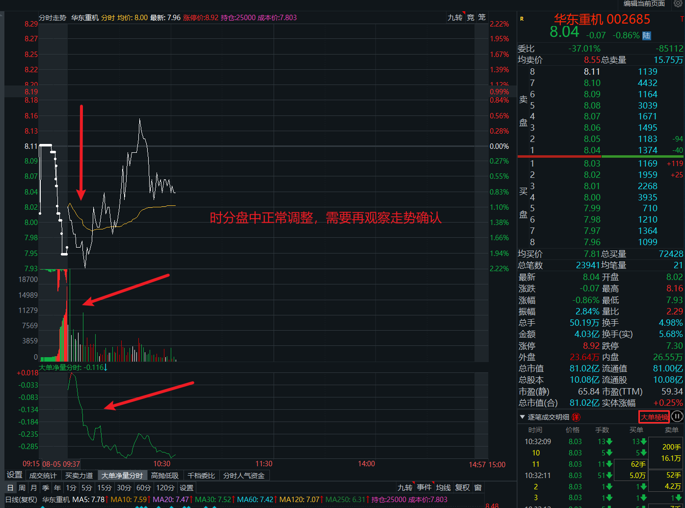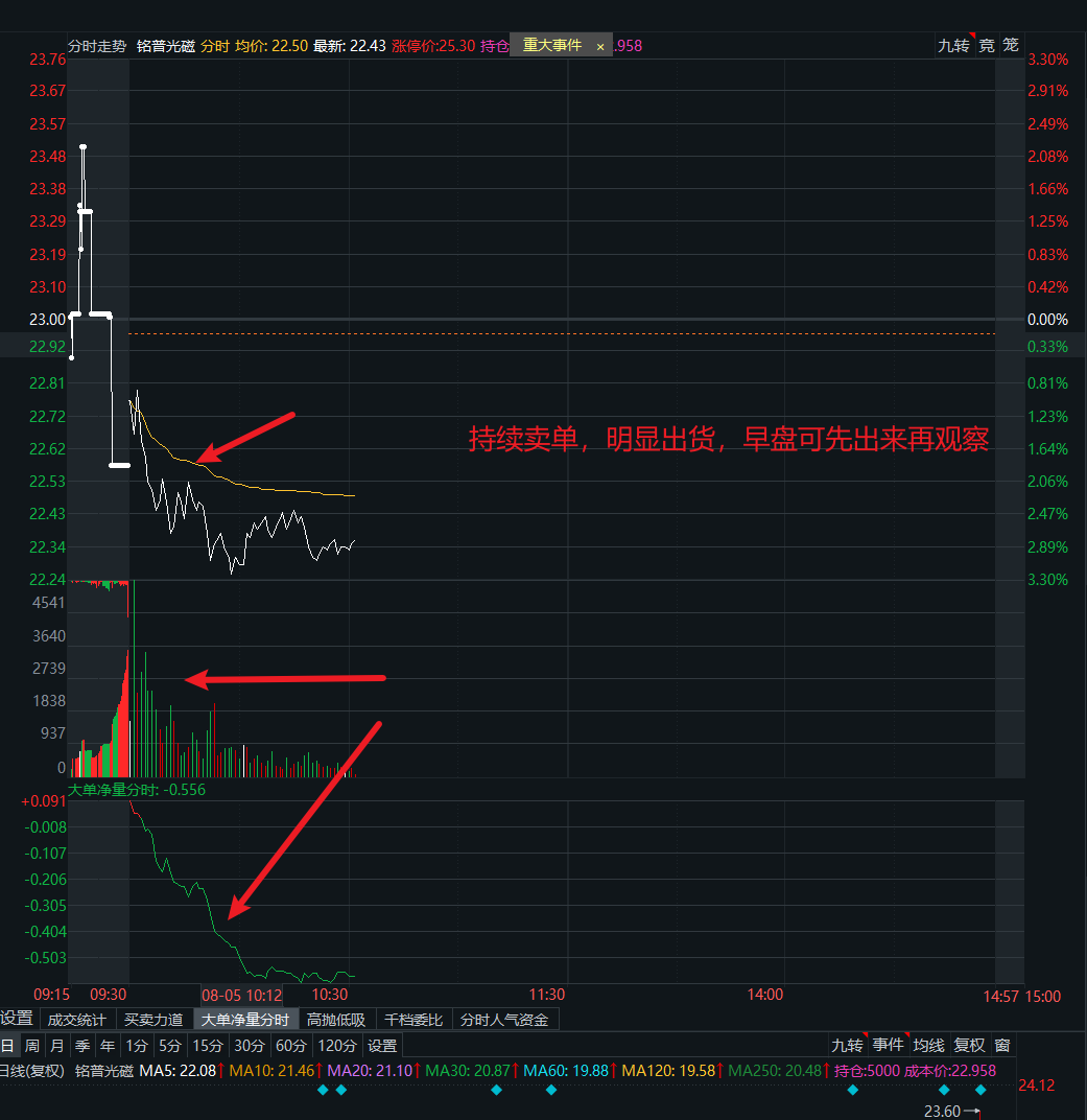 时分走势需要同时观察资金面走势、成交量走势,如果持续卖单且资金持续流出,尽可能先出来观望,背后可能隐藏位置消息或者主力暴力洗盘。当然最主要的是需要权衡仓位水平。