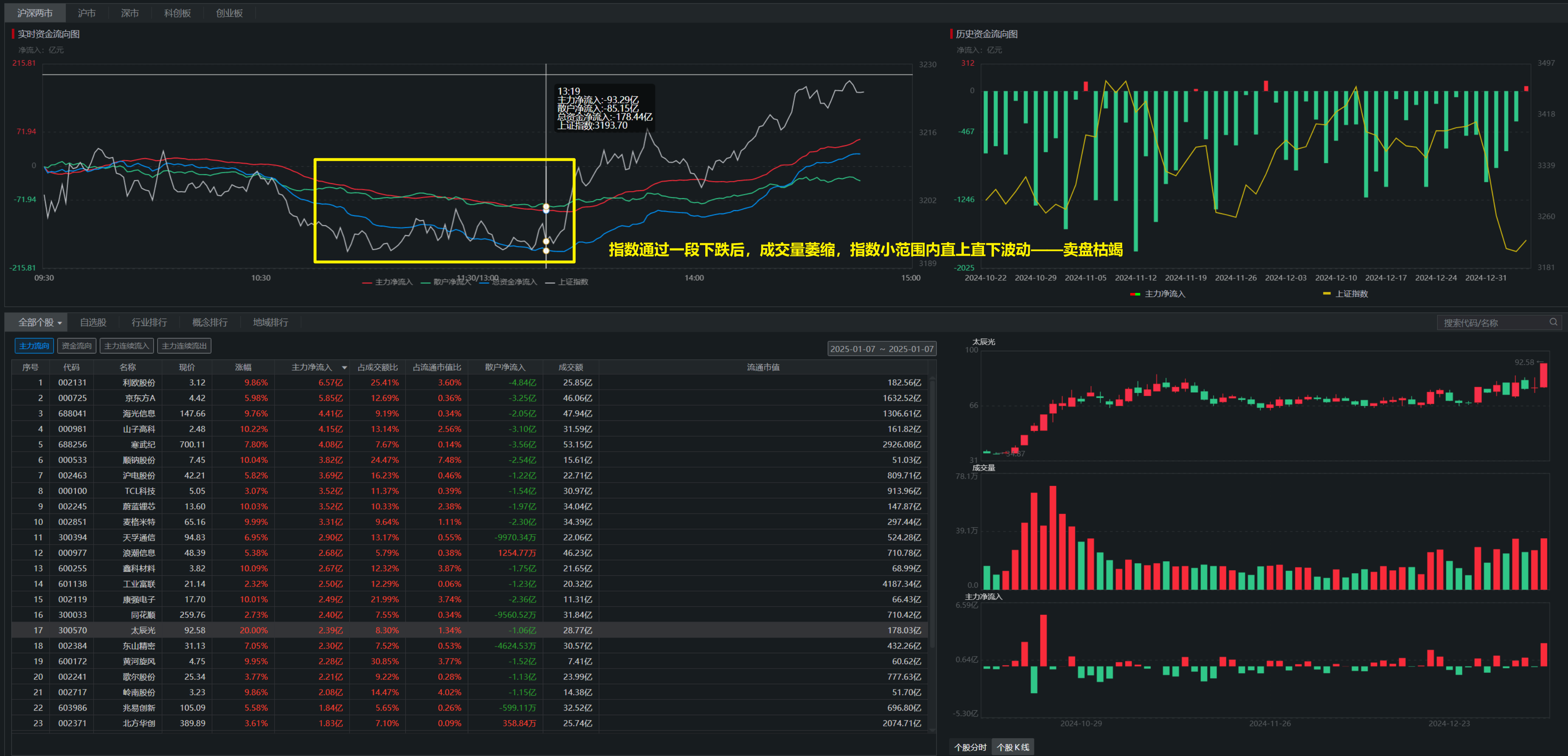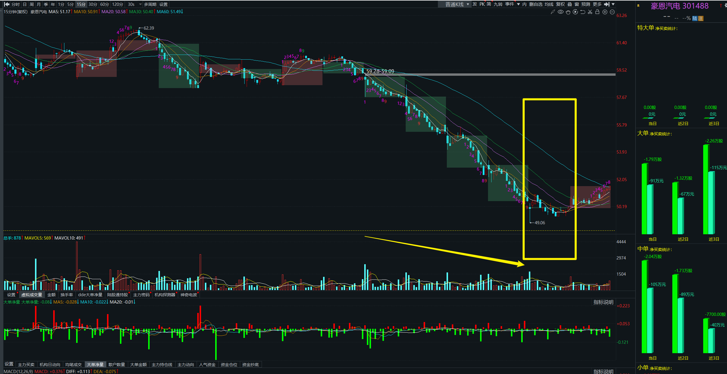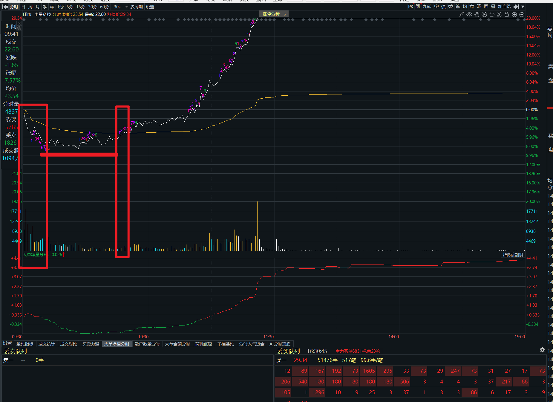 时分图上情绪回暖的重要标志是股价能快速回到黄线上方运行,并伴随资金流入。如果股价拉升回来后资金持续流出,看作诱多信号。
