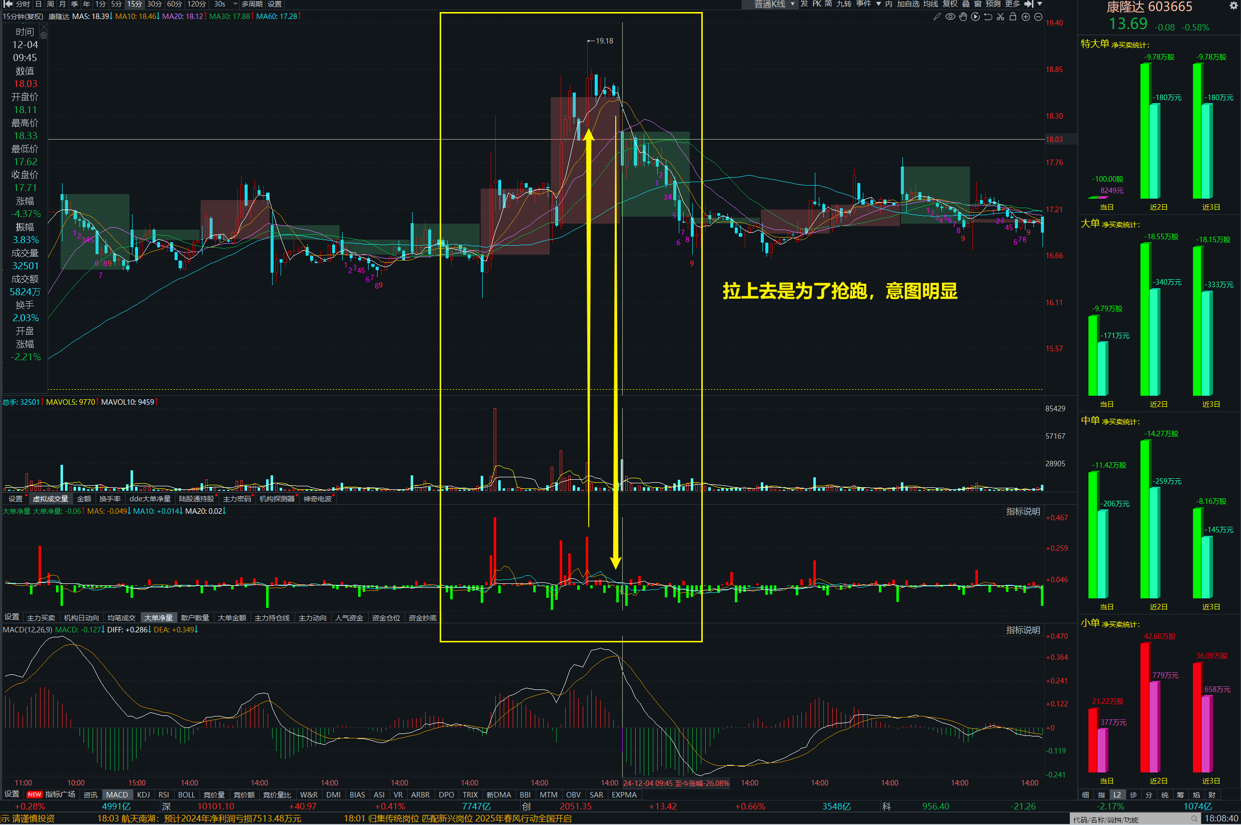 康隆达在2024年12月3日就存在只拉升不封板的情况,拉升后资金开始流出,不坚决