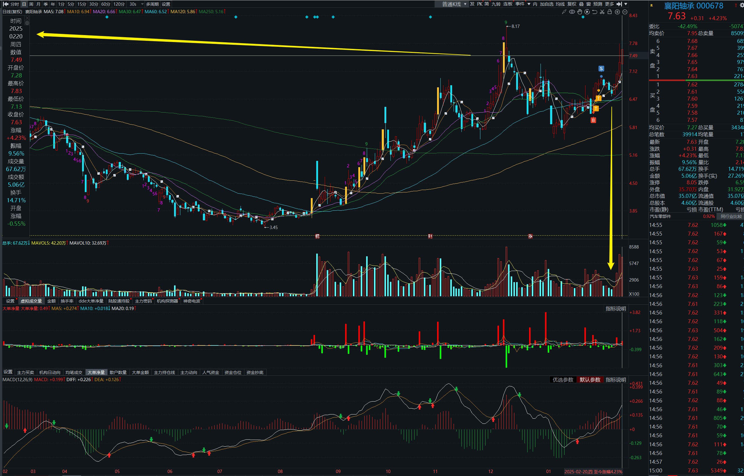资金控盘最明显的特征:股价稳定在黄线上方运行且偶尔有大单吸筹买盘,总体的买单量大于卖单量,成交量的红色立柱偏多且相对密集。 此时如果日K线等其他多周期线在均线上方走趋势,需要密切关注走势异动。