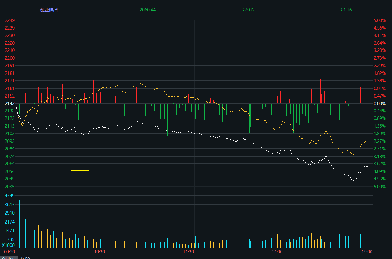 白线:大盘指数,指标股指数,代表大盘股交易情绪 黄线:全盘指数,含中小微盘股,代表小盘股交易情绪