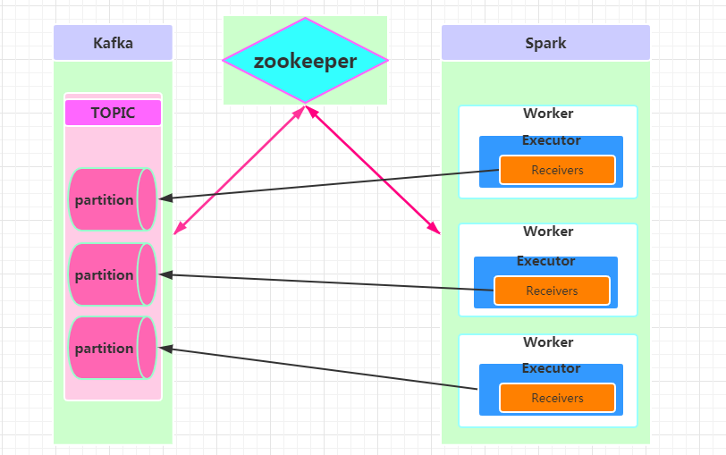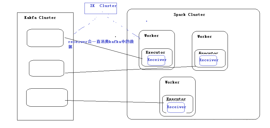 如图,SparkStreaming中的Receivers直接订阅kafka中的消息,并把接收到的数据存储在Executor,这会存在一些问题: