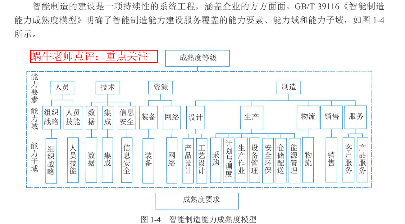 能力要素提出了智能制造能力成熟度等级提升的关键方面,包括人员、技术、资源和制造。 人员包括组织战略、人员技能2个能力域。技术包括数据、集成和信息安全3个能力域。资源 包括装备、网络2个能力域。制造包括设计、生产、物流、销售和服务5个能力域。设计包括 产品设计和工艺设计2个能力子域;生产包括采购、计划与调度、生产作业、设备管理、安全 环保、仓储配送、能源管理7个能力子域;物流包括物流1个能力子域;销售包括销售1个能 力子域;服务包括客户服务和产品服务2个能力子域