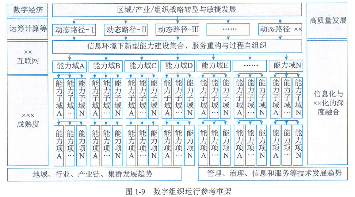 1、组织的数字化转型就是基于组织既有的治理与管理体系、工艺路径和产品技术、服务活动 定义等,打造更加高效的决策效率、更灵活的工艺调度、更多元的产品与服务技术应用和更丰 富的业务模式等。数字化转型需要组织结合信息技术的开发利用,对组织完成深层次变革,可 参考模型如图1一9所示。