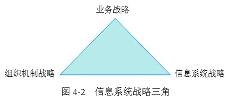 业务战略、信息系统战略和组织机制战略之间的一致性。业务战略是压倒一切的,推动组织机制战略和信息系统战略有机融合,如图4-2所示。