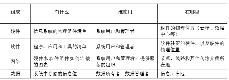 - 信息系统是用来生产和管理信息(数据)的技术(“什么”)、人员(“谁”)和过程(“如何”)的组合。